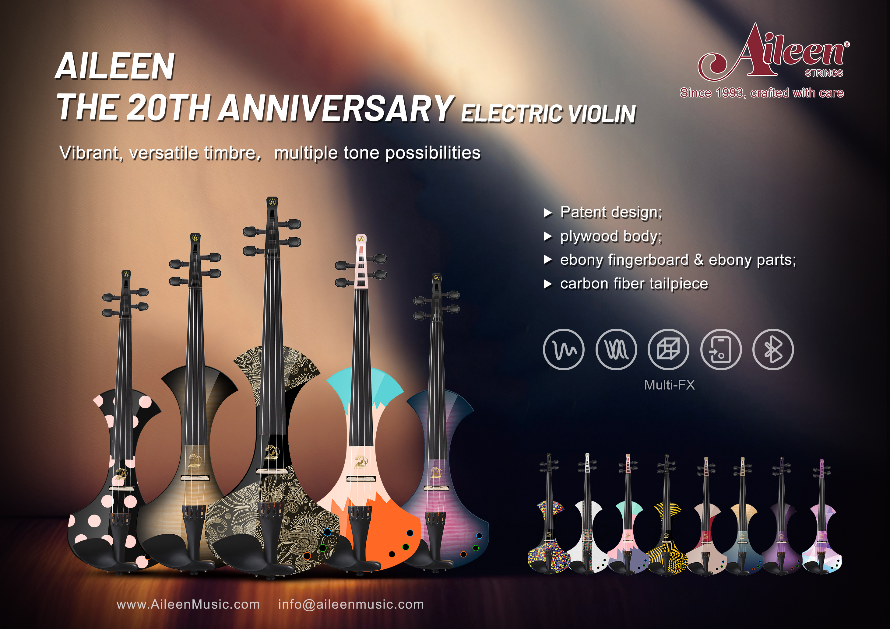 Founded in 1993 by Aileen Gu, Aileen Strings has built a global reputation for instruments that combine refined aesthetics with dependable tonal performance. In the Aileen workshop, each instrument carries the company’s promise — a commitment to craftsmanship, teamwork, careful management systems, and a passion for supporting every musician’s sound and voice.